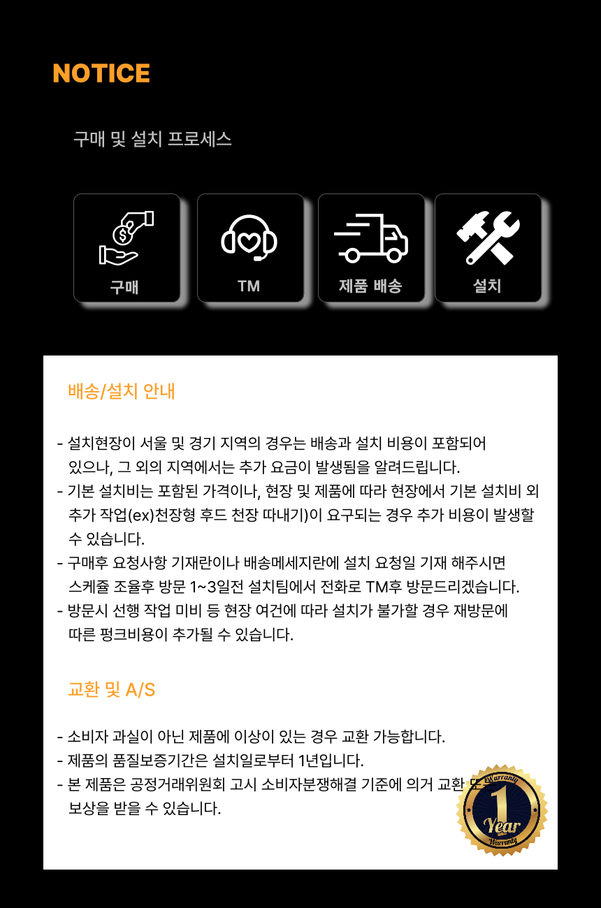 구입후 1년이내 하자 발생시 무상, 이후 유상 A/S